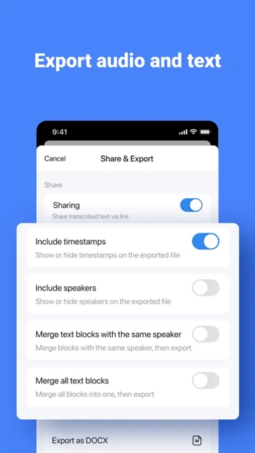 export transcript to TXT, DOCX, SRT, PDF format to save your data offline.