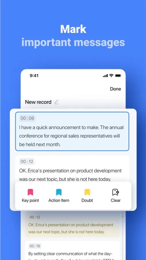 playback your conversations at multiple speeds (0.5x, 0.75x, 1x, 1.25x, 1.5x, 2x, 3x), add notes, mark transcript, move to folders, etc.