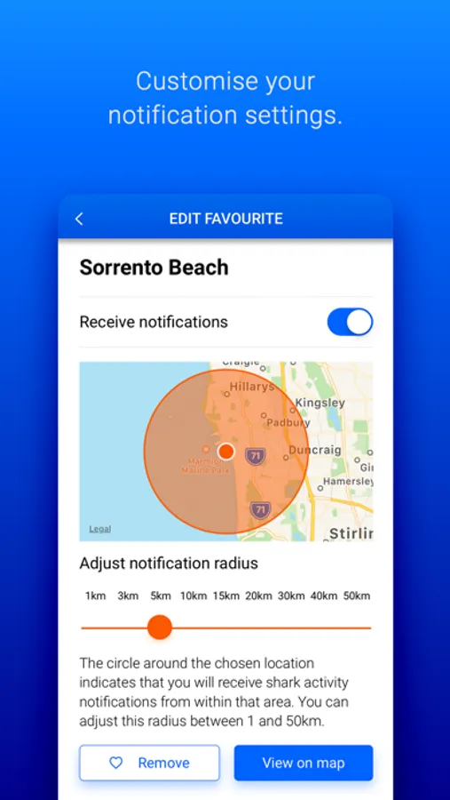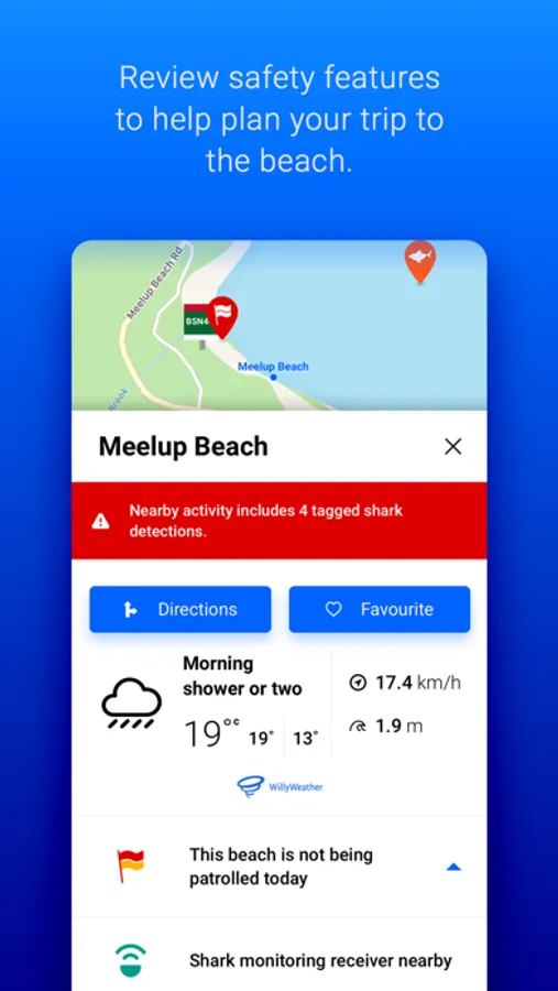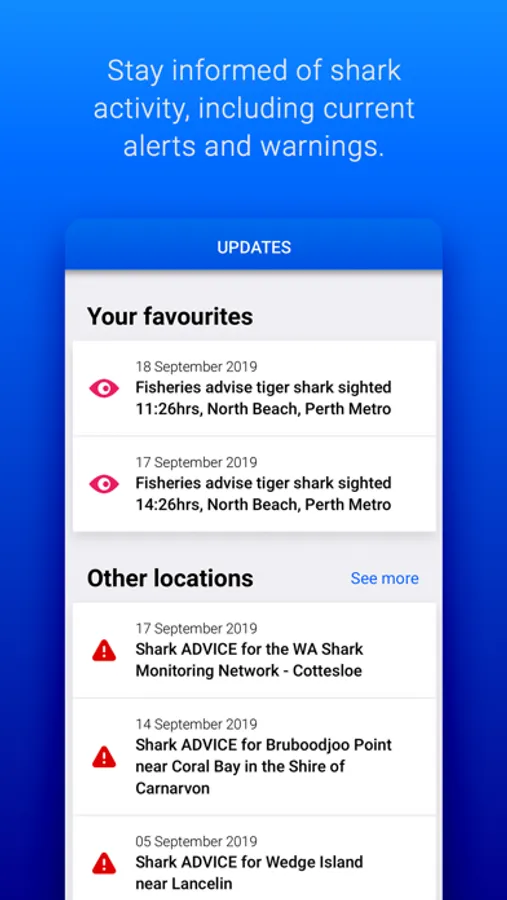 Stay informed of shark activity, including current alerts and warnings. Information is prioritised into ‘Nearby’, ‘Your Favourites’ and ‘Other Locations’, giving you the most relevant information first.