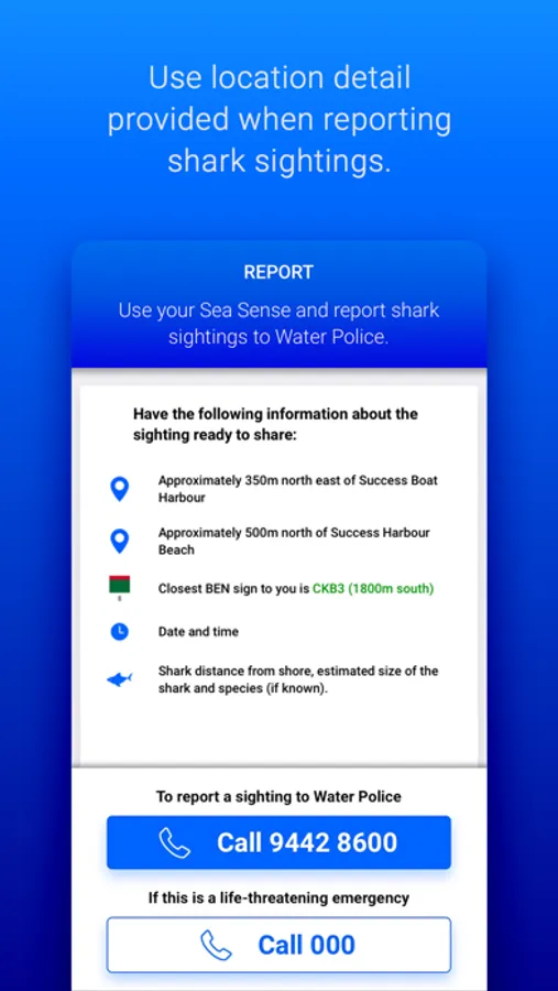 Using location services, the app can provide you with information about your current coastal location. Use the details provided and the quick call link to report shark sightings or whale carcasses (which are known to attract sharks) to Water Police as soon as possible.