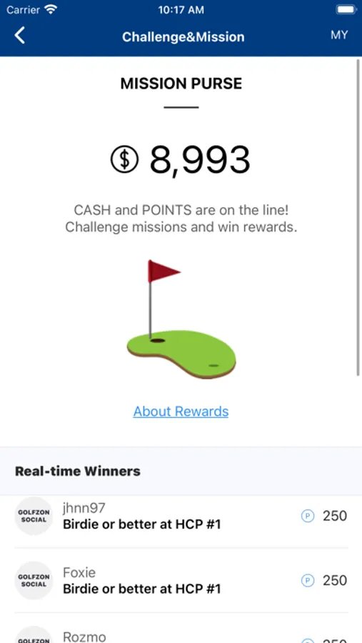 Challenge your golf skills and receive cash or point rewards through Missions such as Par 5 Albatross, Par 3 Hole-in-One, or Par 4 Eagle. You can exchange the cash prize to real money and use Points at GOLFZON SOCIAL shops. Rewards are redeemable only through GOLFZON SOCIAL app.