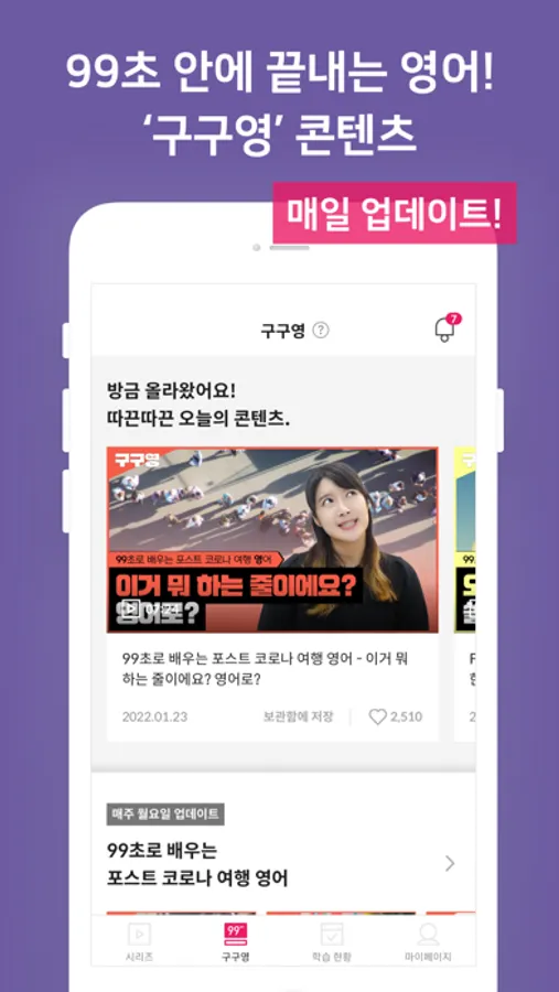 '99초안에 끝내는 영어' 구구영에서 쉽고 간편하게 학습할 수 있는 스낵 콘텐츠를 매일 학습해보세요!