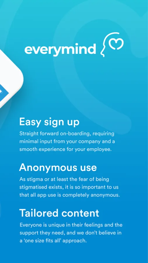 Mental health support in your pocket, whenever you need it. Everymind at Work is provided by your employer, and focuses on improving employee happiness and productivity. Unlike other apps, we take an individual approach to mental health support rather than a one size fits all approach. Tailoring content and support to your needs.