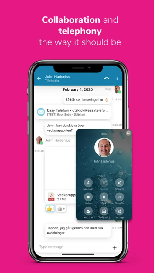 Easy Teams is not just an awesome collaboration tool for your company. Or a great switch board Solution. It's both. Easy Teams allows you to host video conferences, receive calls, chat with Colleagues and customers and share files –all in the same workflow. Take a step into the future with Easy Teams and you’ll get