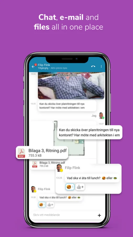 • Chat –Bring your team together and chat directly with colleagues, create channels for different departments or projects