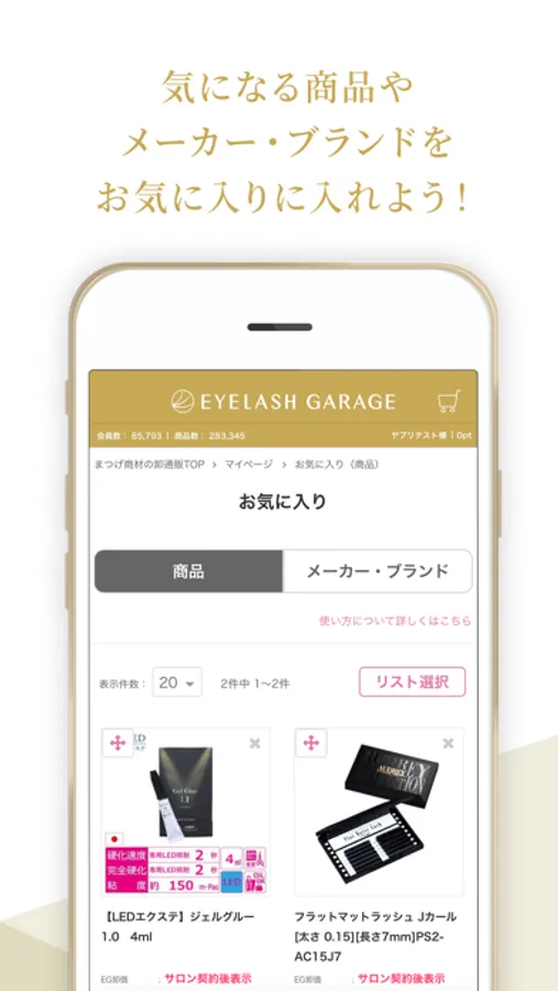 Webサイト「アイラッシュガレージオンラインショップ」で登録した「お気に入り」商品を表示する事ができます。