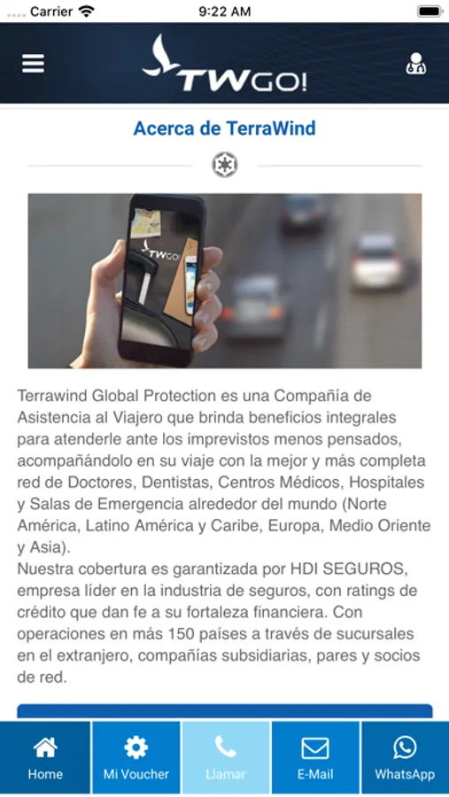 Si necesita asistencia en su viaje con TWGo! la nueva app de Terrawind, podrá contactar rápidamente con la central de asistencia las 24 horas para asistirlo en lo que necesite. Con nuestra app... viaje seguro, viaje tranquilo.