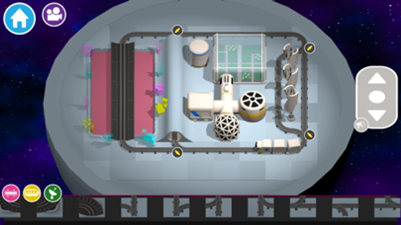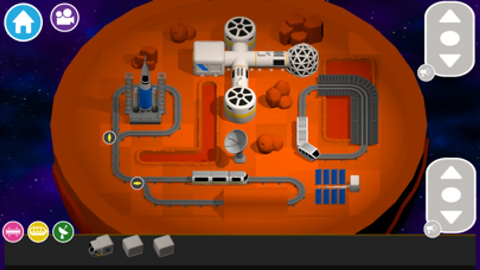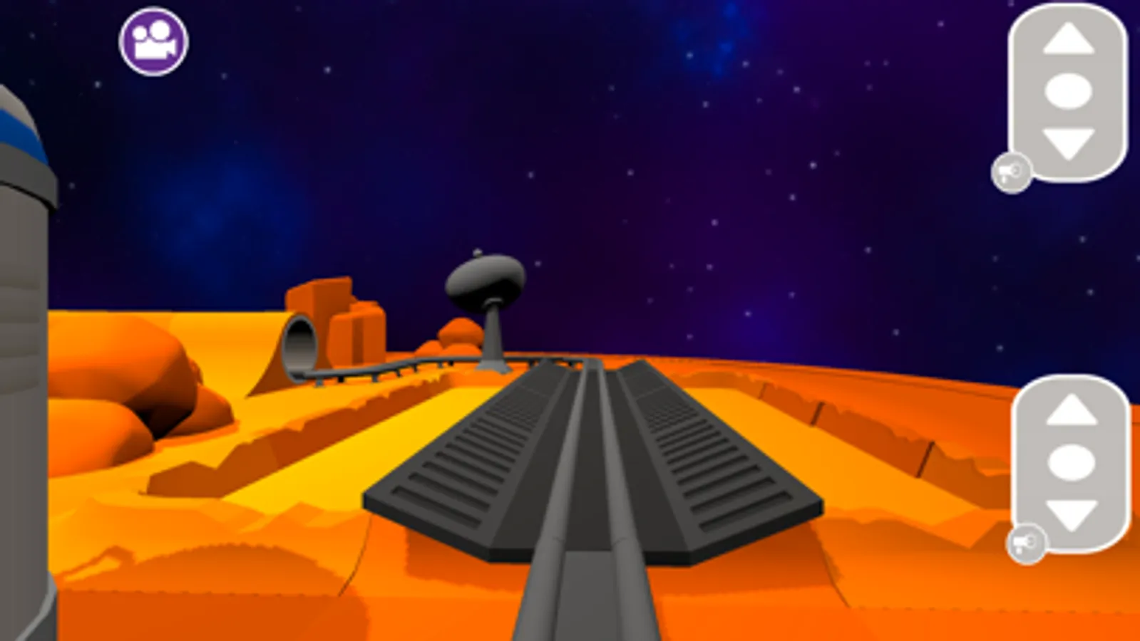 Switch to train driver view to get a first person view of your interplanetary space port as you whizz around.