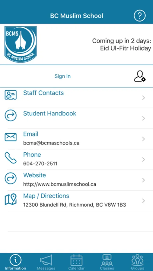 * Conveniently e-mail, phone, or navigate to the school, or reach the website or social media.