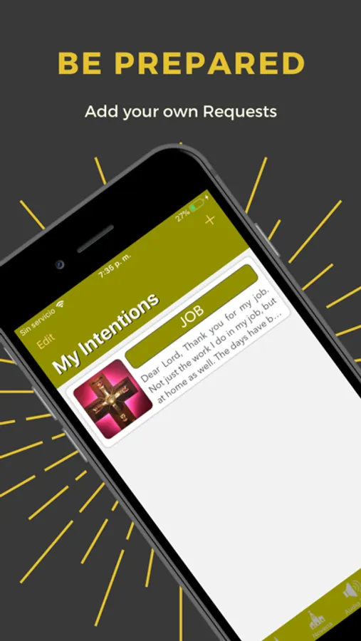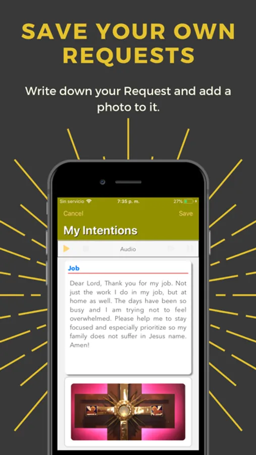 It allows you to save your own prayers to say them every day and not forget them, allowing you the greatest concentration. You can save text accompanied by a photo to help you meditate and visualize your own prayer. In addition, the audio of the saved prayer can be played.