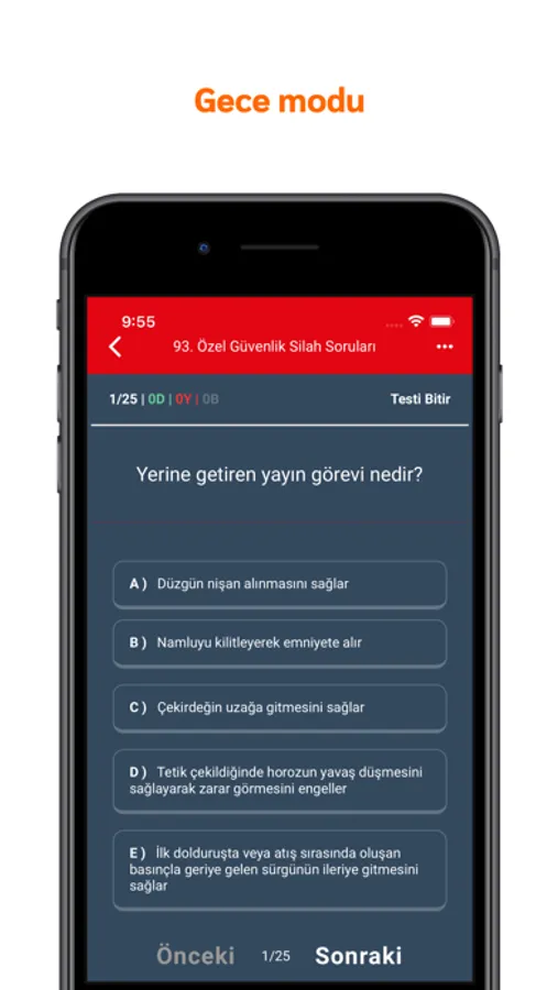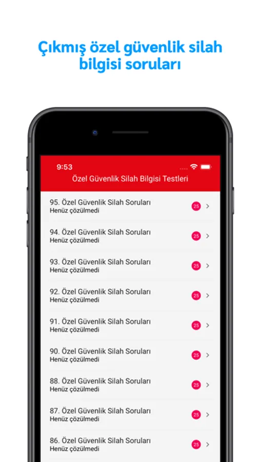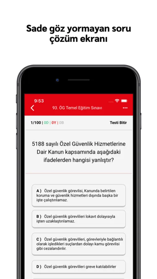 Yayınlanmış tüm Özel Güvenlik sınav soruları uygulamada yer almaktadır hemen sınava hazırlanmaya başlayabilirsiniz. Silahlı Özel Güvenlik Testleri 25 sorudan oluşmakta. Özel Güvenlik çıkmış sınav soruları ise 100 sorudan oluşmaktadır. Özel Güvenlik adayları bu uygulama sayesinde sınavda başarılı olmanız için elimizden geleni yaptık ve tüm yeni ve eski çıkan tüm soruları ekledik. 2019 ve öncesi Özel Güvenlik sınav testleri de mevcuttur.