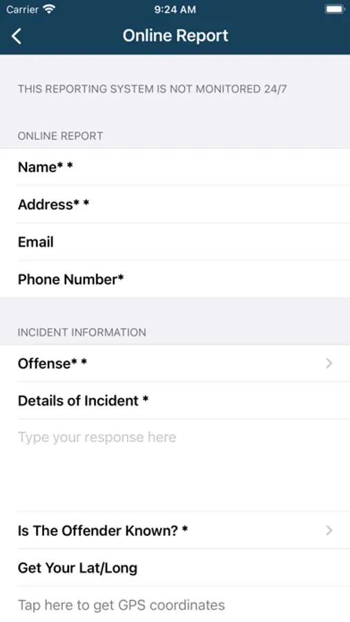 This app is not intended to be used to report emergency situations. Please call 911 in an emergency.