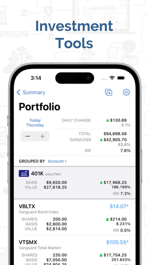 Banktivity's investment features manage stocks, bonds, mutual funds, IRAs, 401Ks, CDs and other assets. You can track buys, sells, splits, dividends, options and more. Banktivity calculates IRR, ROI and gains and losses. You can even pick which lots you've sold from.