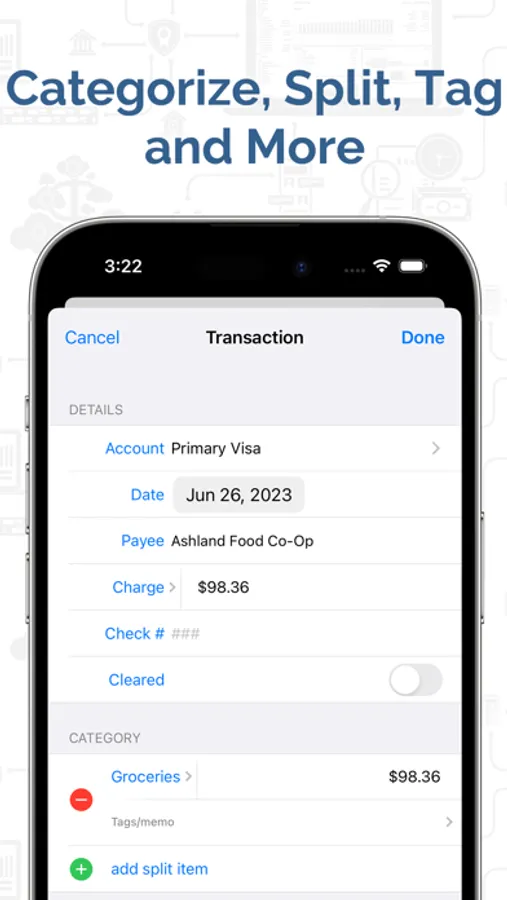 No matter where you are, you can enter transactions on the go with Banktivity for iPhone. And you can sync accounts, budgets and investments to Banktivity for iPhone/iPad for mobile money management.