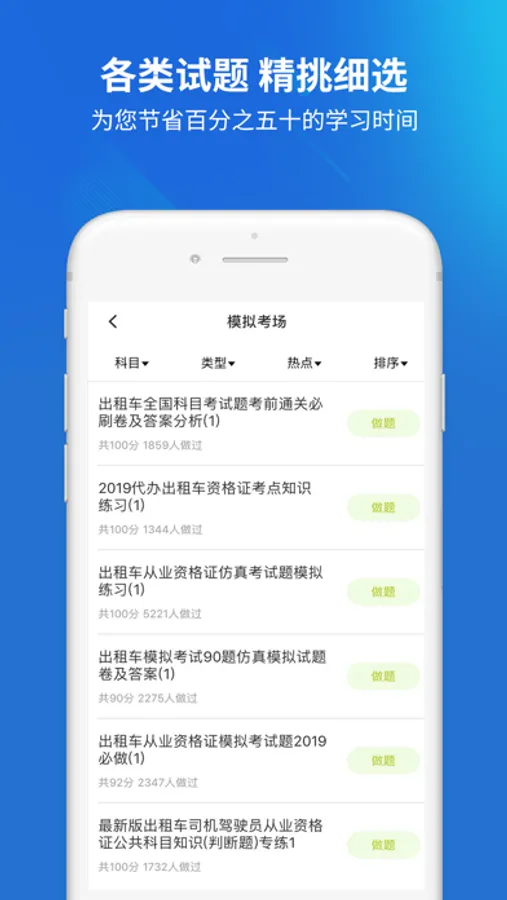 上学吧出租车资格证题库有模拟考场、历年真题练习、每日一练、快速练习、考点练习、考试押题、做题记录等多种学习与做题模式、丰富多样化的陪你一起考出租车资格证考试。