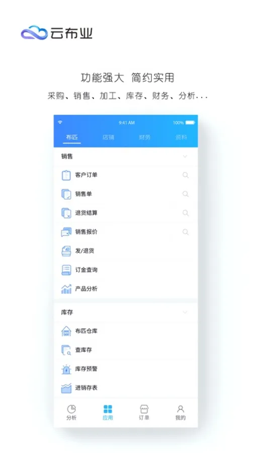 云布业:针对纺织行业研发的管理软件,轻松查询企业的:订单、纱线、下织、坯布、成品、库存、采购、加工、销售、财务等情况。
