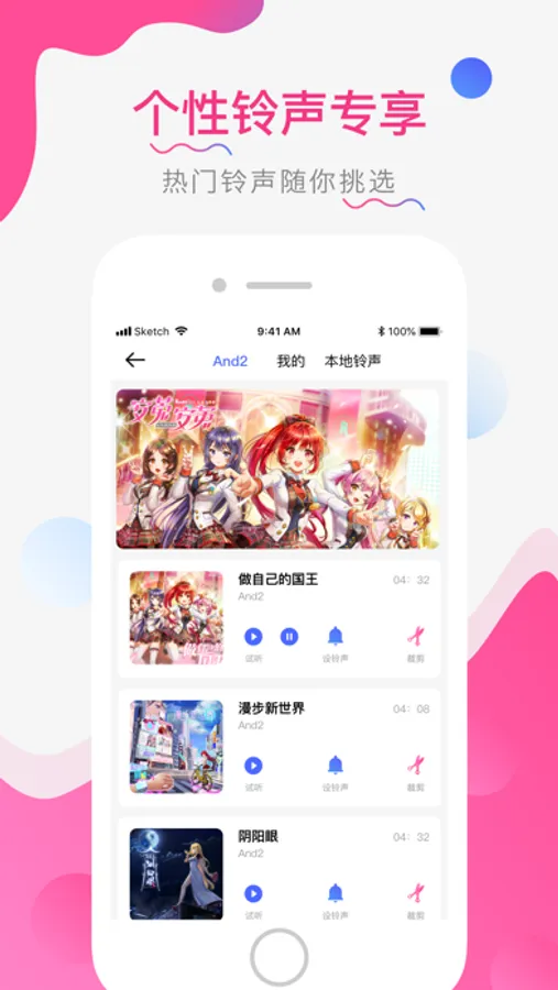 铃声快速设置,界面清晰、操作简便。快速设置成为铃声、闹铃、来电、短信声。拥有独家虚拟偶像安菟专属歌曲,可快速设置成为铃声。