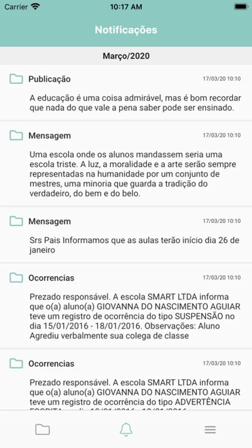 Avisos, ocorrências escolares, declaração de pagamentos, enfim....