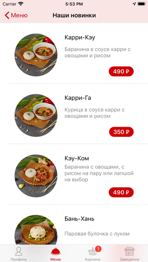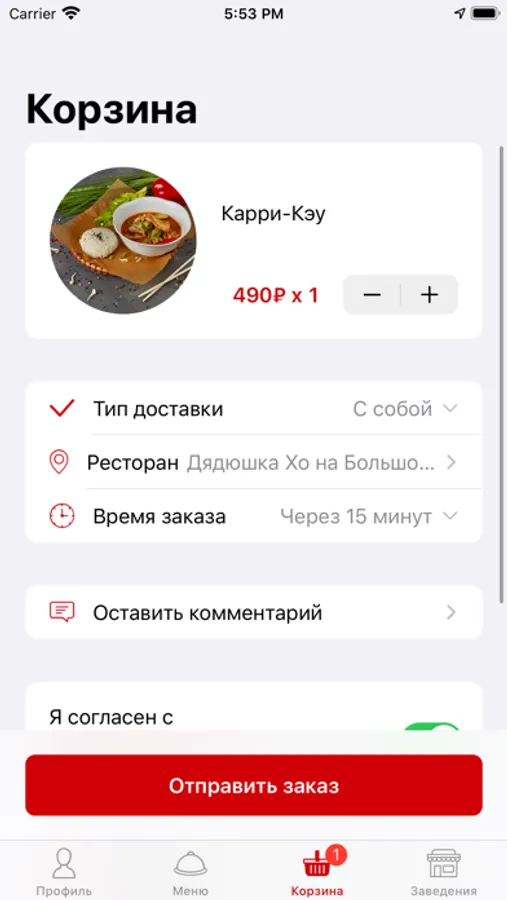 Как сделать заказ в приложении “Дядюшка Хо”: выберите понравившиеся позиции из меню, добавьте их в корзину и перейдите на экран оформления заказа (по нажатию на иконку корзины).
