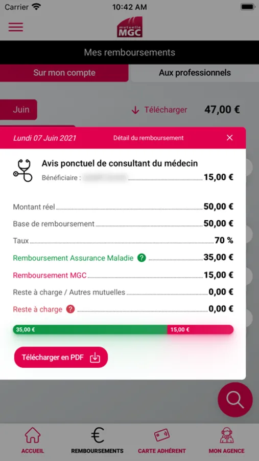 - Le suivi de vos remboursements avec la possibilité de télécharger vos décomptes et de réaliser des recherches selon différents critères (date de soins, bénéficiaire, type d’actes remboursés …)