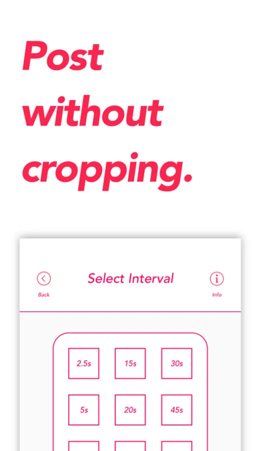 Chop Video lets you take long video clips and split them into perfect segments. Choose between lengths of 2.5s, 5s, 10s, 15s, 20s, 25s, 30s, 45s, and 60s. Videos are saved to your Photo Library, ready for you to post to Instagram or other social media.