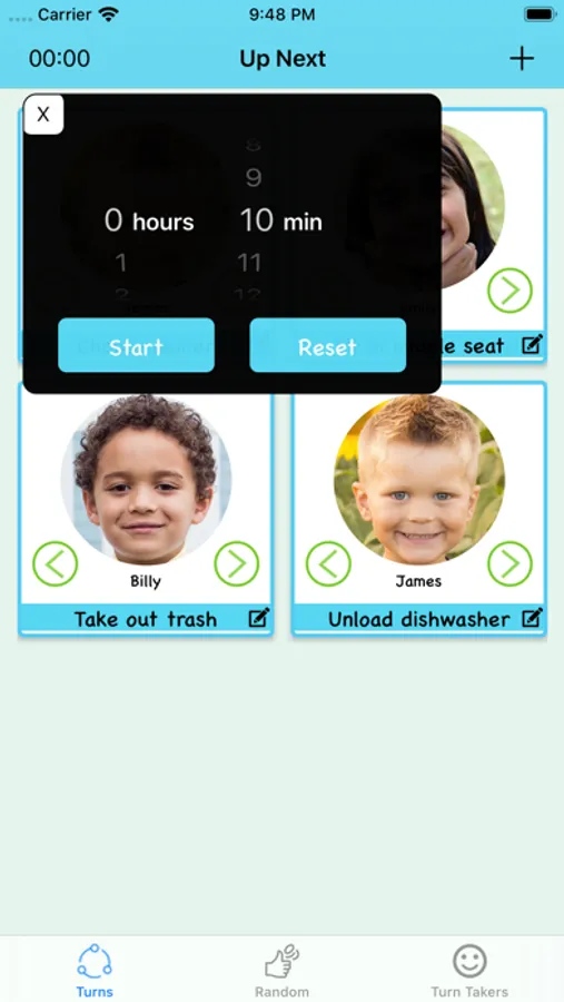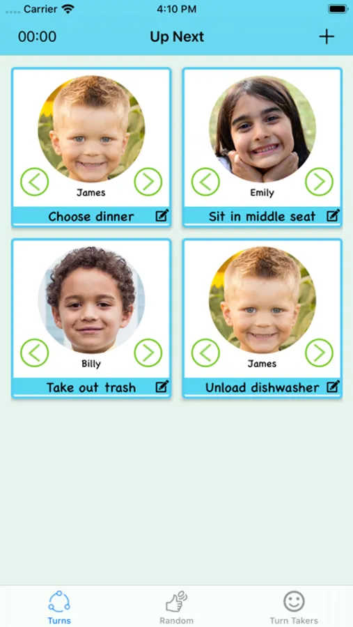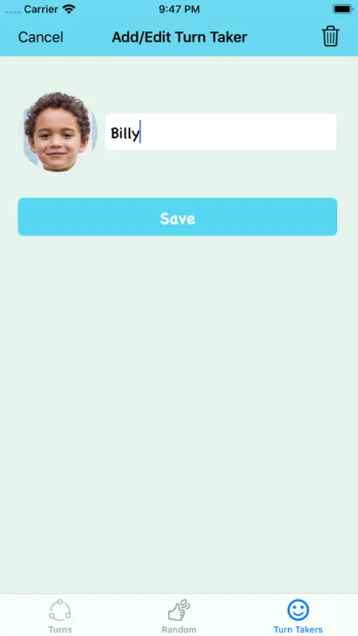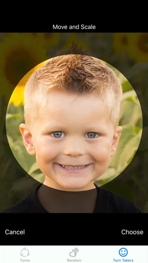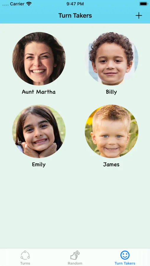 1. Go to the Turn Takers tab to add people that will be taking turns doing things. Take or choose a photo (zoom and crop the face for best results) and enter their name.