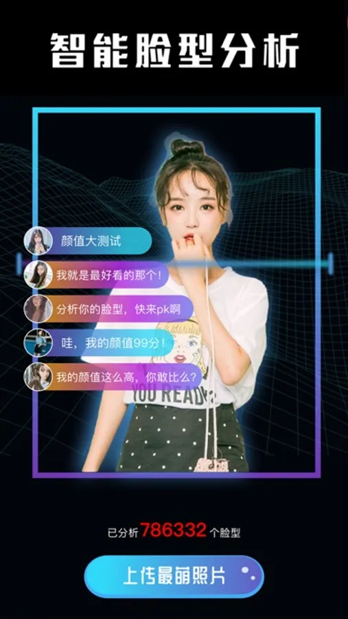 测脸型APP为您提供一键脸型颜值测试,根据您的脸型、额头大小、双眼距离、鼻子位置、嘴巴下巴的大小等,为您提供在线、及时的脸型颜值测试,只需您轻轻一拍,颜值立马揭晓。