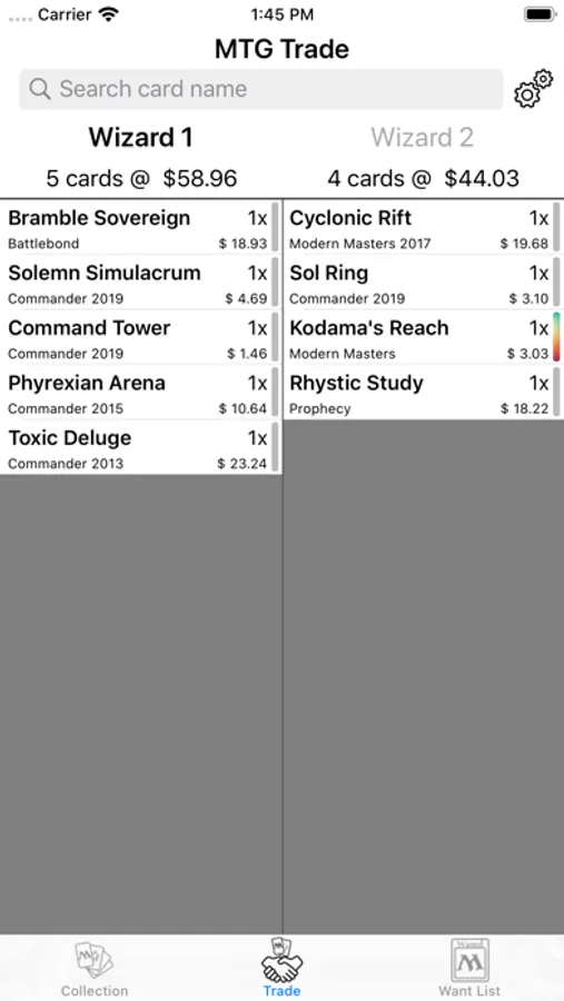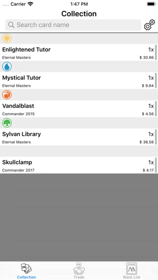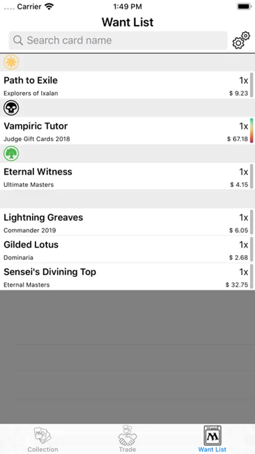 To add cards for trade, Go into the trade tab and tap on the search bar and enter the card name. Select the card, then select the printing it is from. It will be added to the list.