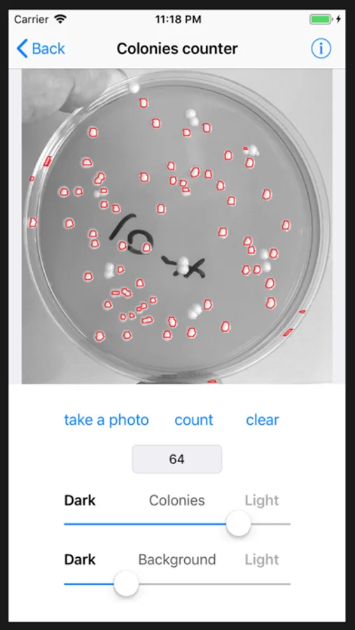 It also includes a colonies counter. The photo of a Petri dish can be directly taken by iPhone camera or imported from the iPhone photo library.