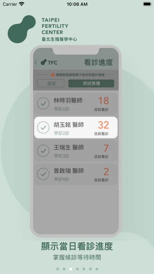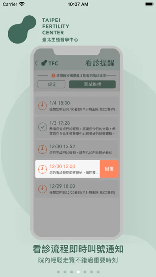 報到後:貼心推播通知候診、叫號、門診、檢查等每個流程、步驟