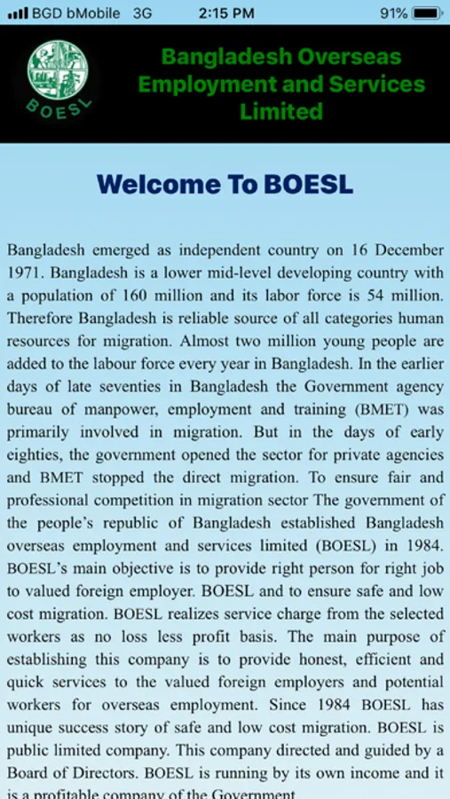 Bangladesh Overseas Employment and Services Limited (BOESL) is only the "State owned" Manpower exporting Company in Bangladesh. The Government of the People's Republic of Bangladesh established Bangladesh Overseas Employment and services Limited (BOESL) in 1984 to earn more foreign exchange by way of exporting skilled and unskilled manpower. Its motto is to offer best services as a development partner based on mutual trust and to minimize migration cost in comparison to others. BOESL's main objective is to provide Right person for Right job" to valued foreign Employer.