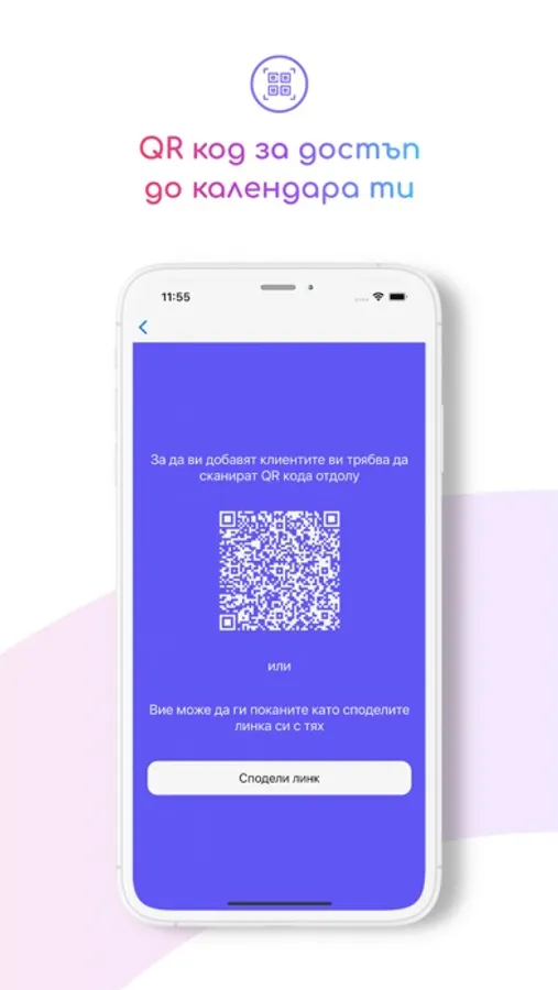 Ще получиш своя уникален QR код, който клиентите ти могат да сканират директно от телефона си и по този начин да позволиш само на тях да виждат календара ти.