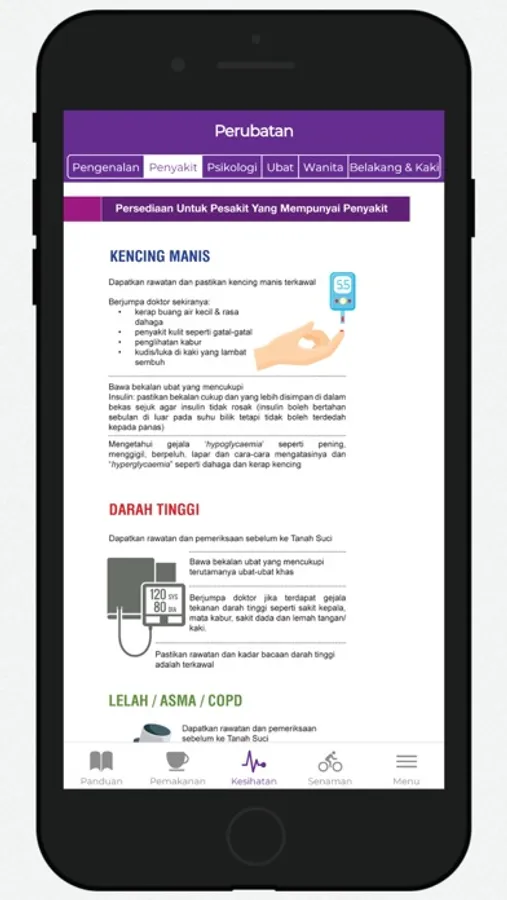 i. Menyediakan panduan dan rujukan berhubung kesihatan mental dan fizikal kepada para jemaah dalam membuat persediaan untuk mengerjakan haji dan umrah.