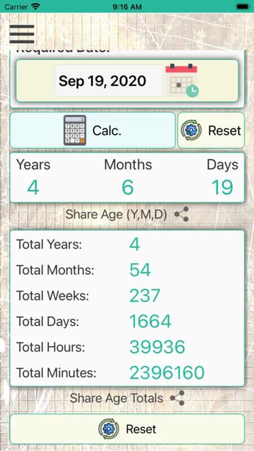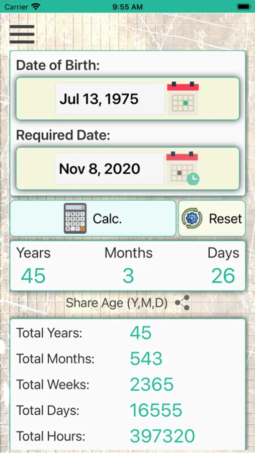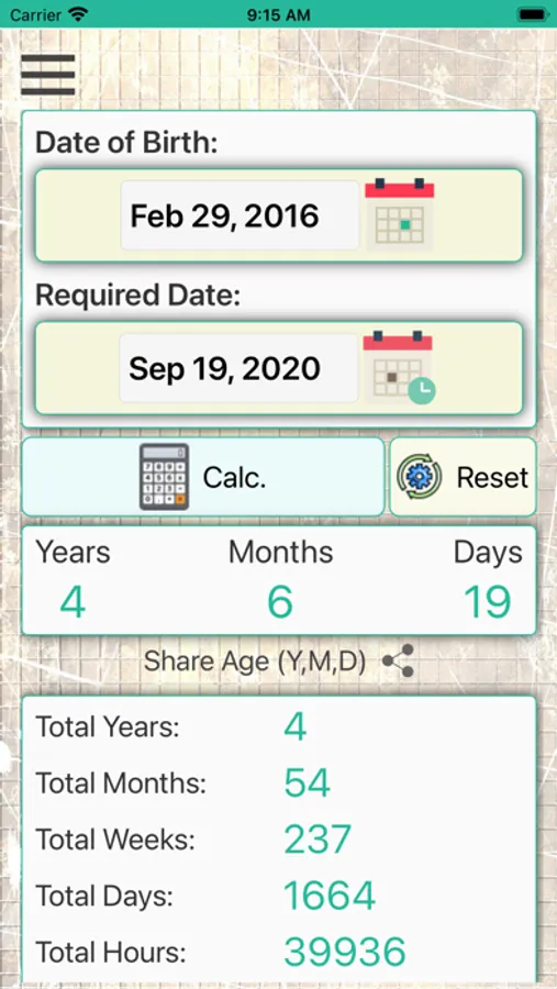 An Easy to use App to Calculate an Age and date difference in (Years, Months, Days) & Total (Months, Weeks, Days, Hours, Minutes) by providing date of birth and a specific date, super simple, and super useful in many cases such as calculating person's age, calculating child's age for school admission, calculating baby's age in months & days, and to calculate difference between any two dates. And you can share the calculation result.