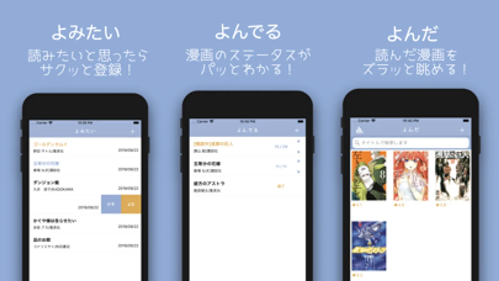 このアプリは「何の漫画が読みたくて、何の漫画をどこまで読んでいて、読んだ感想は何かをカンタンに記録」することができます。
