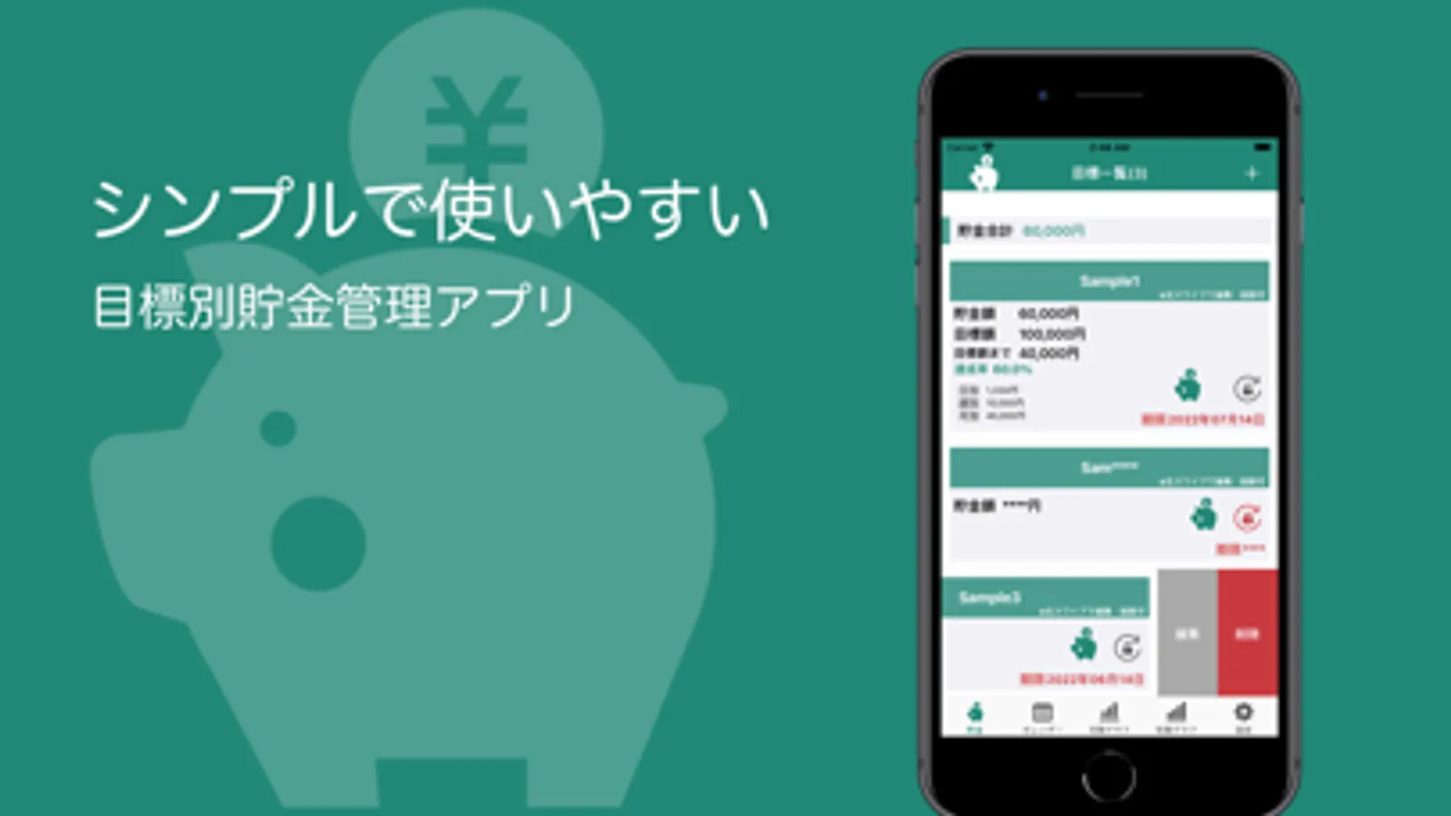 「目標」を複数作成できて目標毎に貯金が出来ます。