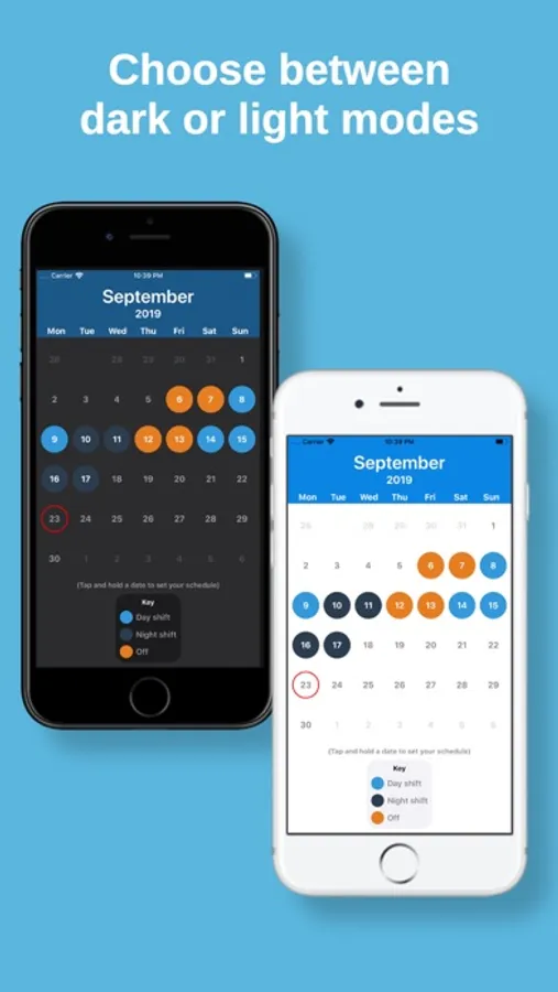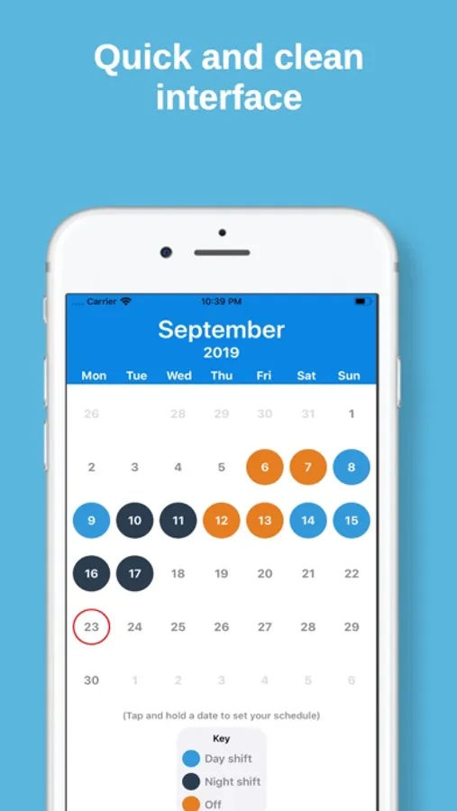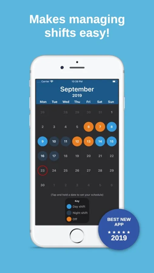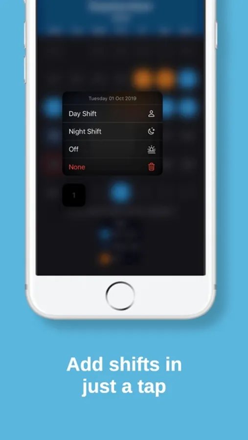 Easily add day shifts, night shifts and off days to your custom color-coded calendar.