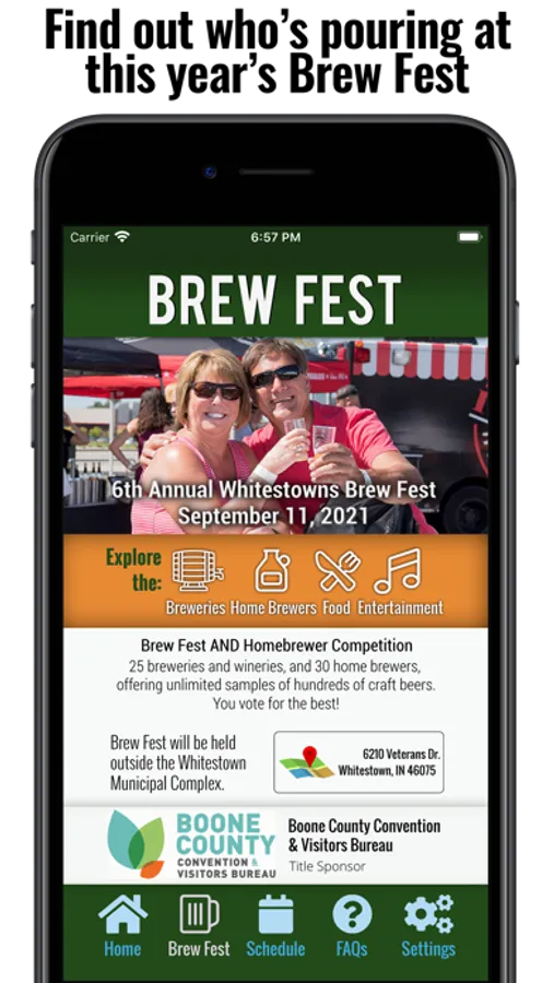 Craft beer catch your interest? Use the app to find out details about the Whitestown Brewfest beer festival and homebrewer competition where YOU help choose the winner. This annual event features breweries, wineries, and distilleries from across Indiana. Enjoy unlimited samples as you decide which is the best! Use the app to check the latest vendor line-up and get competition notifications right from your phone the day of the event.