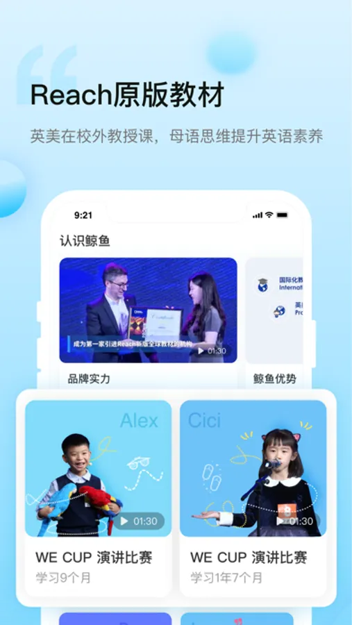 鲸鱼小班使用美国国家地理出版的课本《Reach》,它是全美排名前三的教材,超1000所美国学校使用。学习《Reach》 的小朋友,成绩比学习其他教材的小朋友高45%。