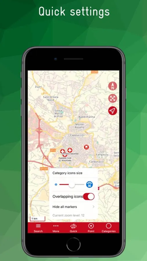 POIs are grouped into categories and can be displayed as layers. For example, you can display all restaurants, public transport lines, banks, hiking trails, charging stations and doctors on the map. The size and overlap of the icons can be adjusted to improve clarity.