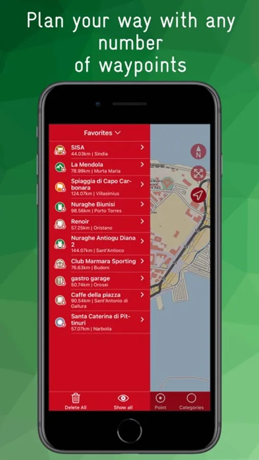 An integrated database allows you to search for POIs as well as a large number of streets, towns, villages, districts, etc. The search can be filtered by category and/or distance.