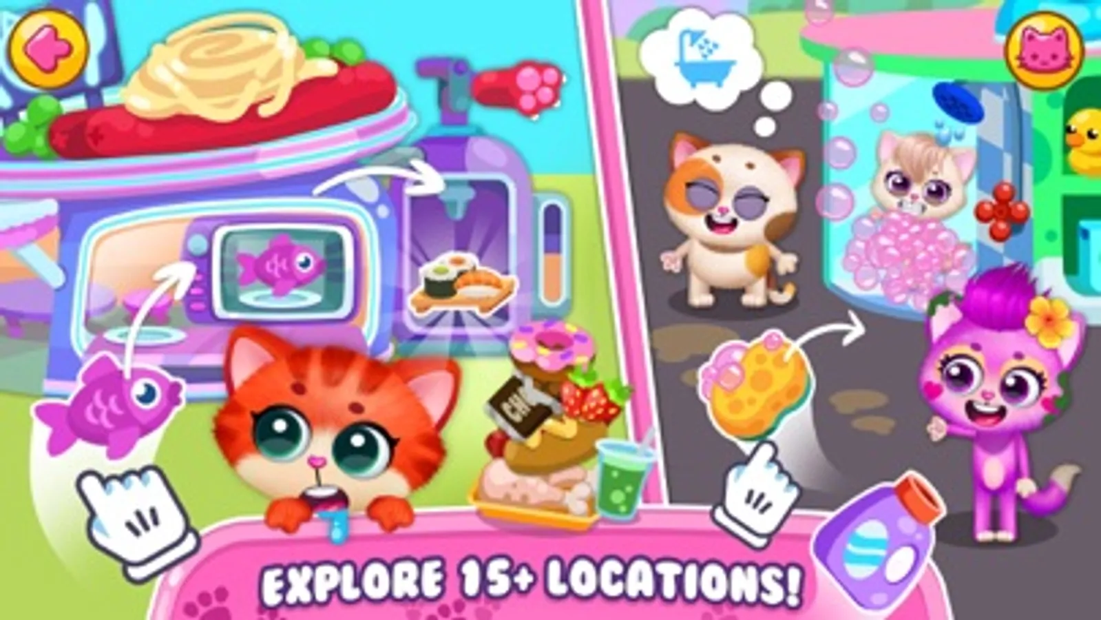 NEW! Even more cool surprises, fun locations and cute cats! Become friends with a robot kitty! Visit brand new music and car shops. Play basketball and have fun with a bubble machine! Find a piñata and discover more secrets of Little Kitty Town!