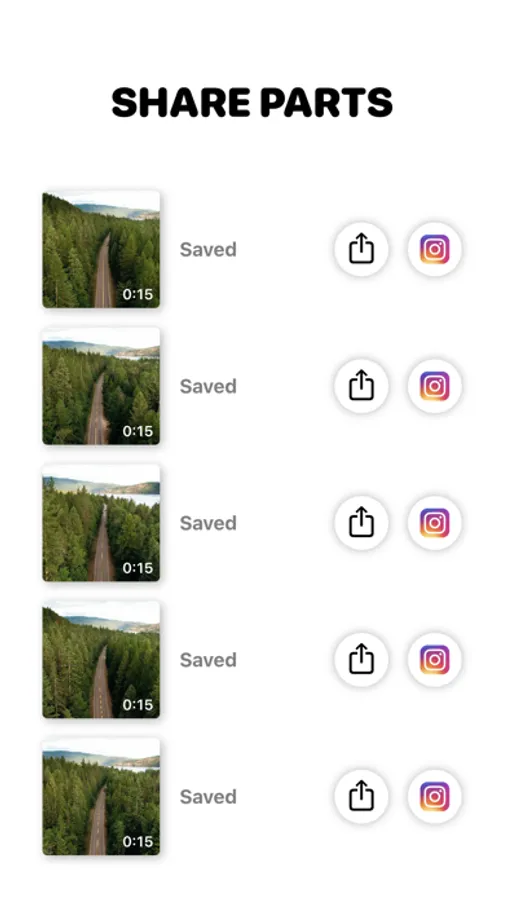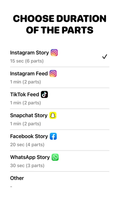 Parts app will take videos of any length from your photo library and split them into segments. You can choose any segment length, for example 1 min for Instagram Feed and TikTok or 15 sec for Instagram Story.