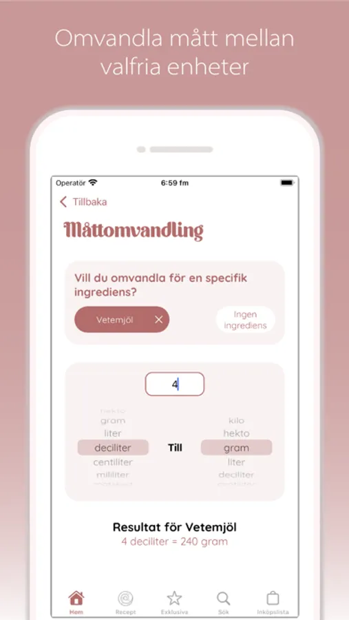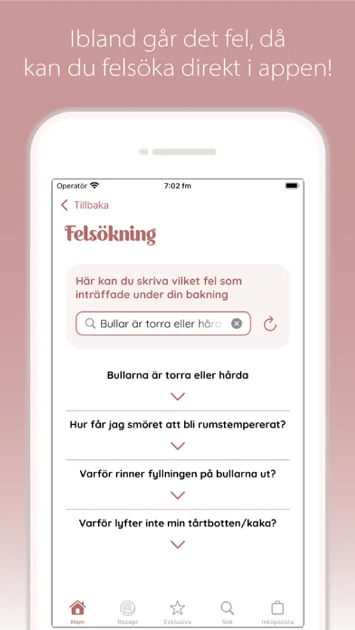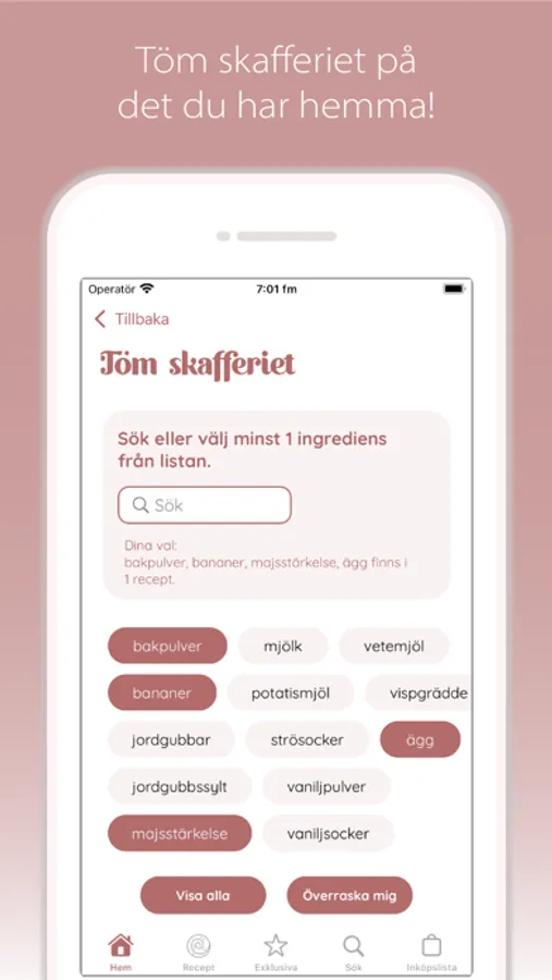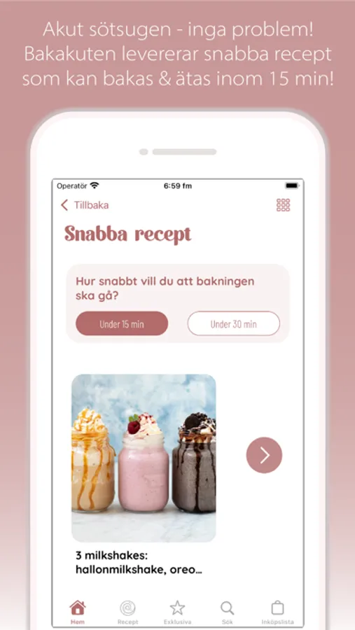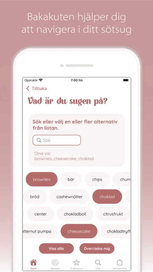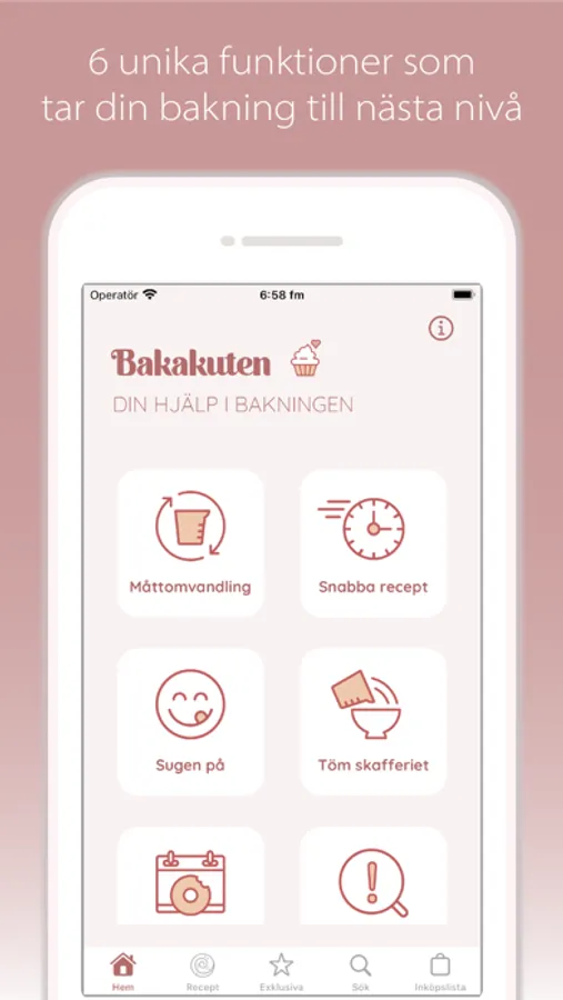 Deciding what to bake is not always easy. "Bake in a hurry" helps you to not only navigate your cravings but also among the ingredients you already have in the pantry and fridge. If you have a decision anxiety, you can either ask "Bake in a hurry" to surprise you with a recipe that contains the ingredients you have chosen or simply show you all the recipes at once. The ingredients you do not have you add at the push of a button to the shopping list so you do not forget something when you are in the store.