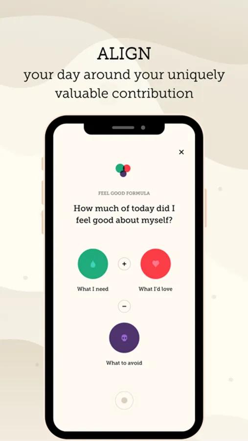 You will log what you need to have a good day, what you would love to have a great day, and what you need to avoid in order to experience the best day possible. Through reviewing your days, the app helps you understand the patterns for you to have a great day, and provides you with the tools to increase the number of good days you have by aligning around your uniquely valuable contribution.