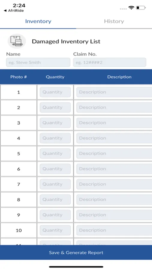 The App allows the user to inventory multiple items with a full description i.e. brand, model, location, damage code and replacement value.