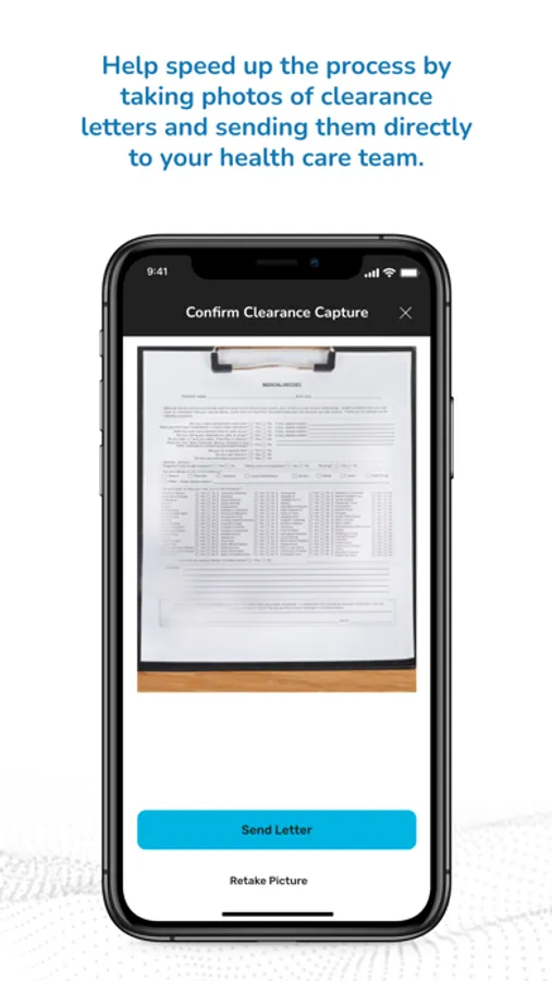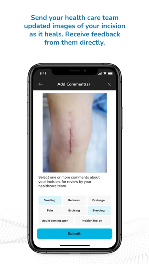 • The ability to send images of the incision site, clearance documents and medications to your healthcare team. Knee replacement patients can also share range of motion photos. Receive feedback directly from your healthcare team.