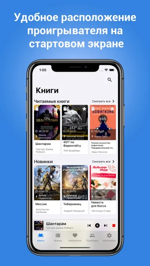 Мы ценим удобство пользователей, поэтому приложение разработано так, что Вы сможете прослушивать аудиокнигу, при этом не находясь в приложении.