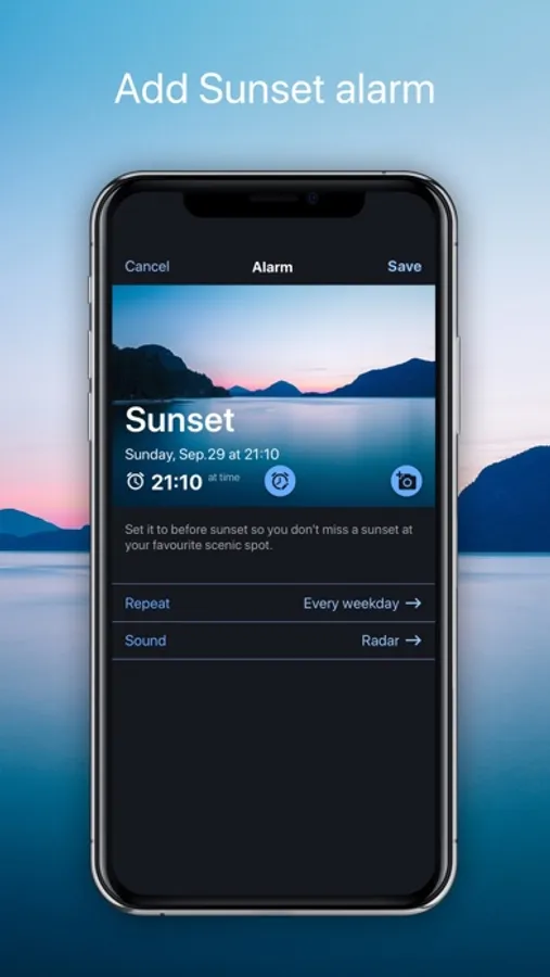 - Set it to 45 minutes before sunset to take that evening walk and be sure you get back before dark.