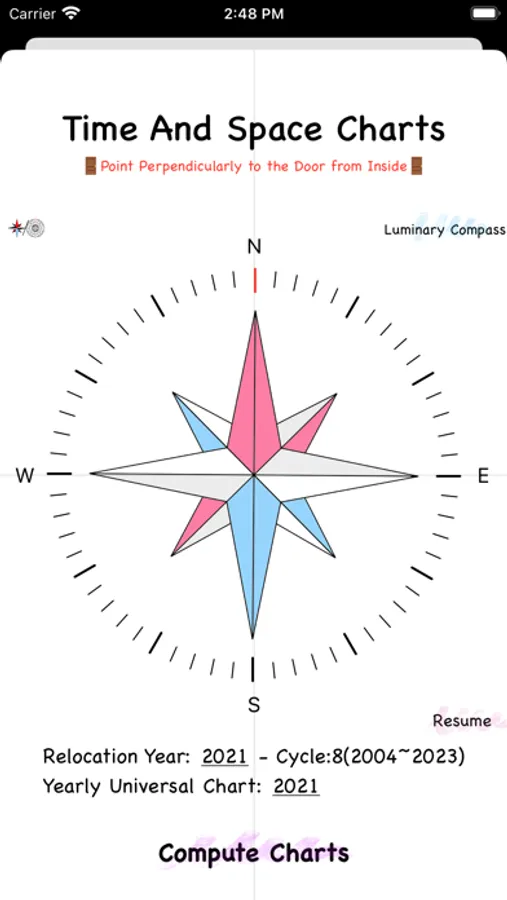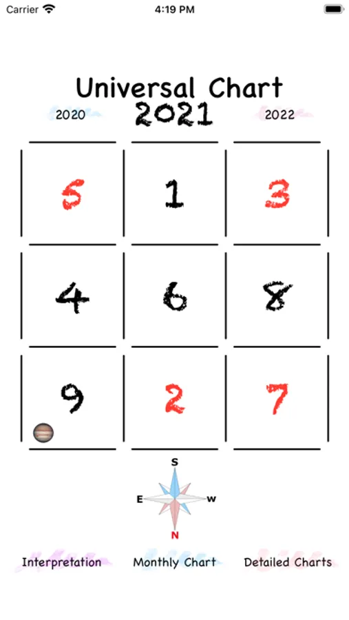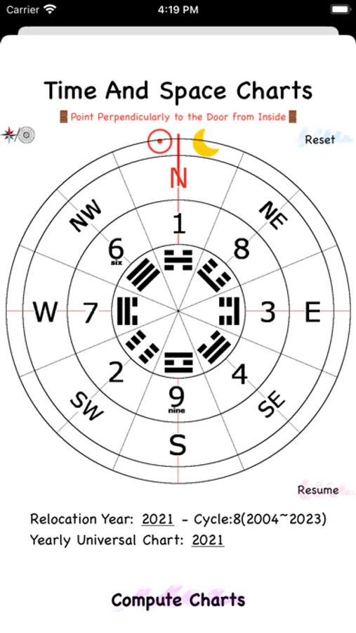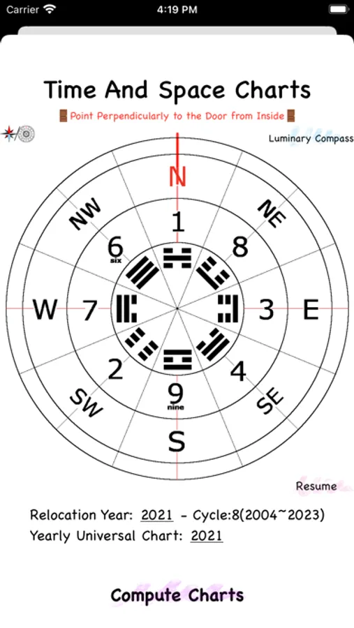 3rd, Tap View Chart and it will chart your house's chart and a yearly chart. And then you could check the interpretation and suggestions to decorate your house to increase your fortune or to avoid the bad luck. The decorations are simple. If you see that you need some water element on a direction(a block in the matrix), just put a cup of water there. If you need fire element, just put a pink card paper or other material in pink there. Of course you have many options for every element. But sometimes there's nothing we can do.